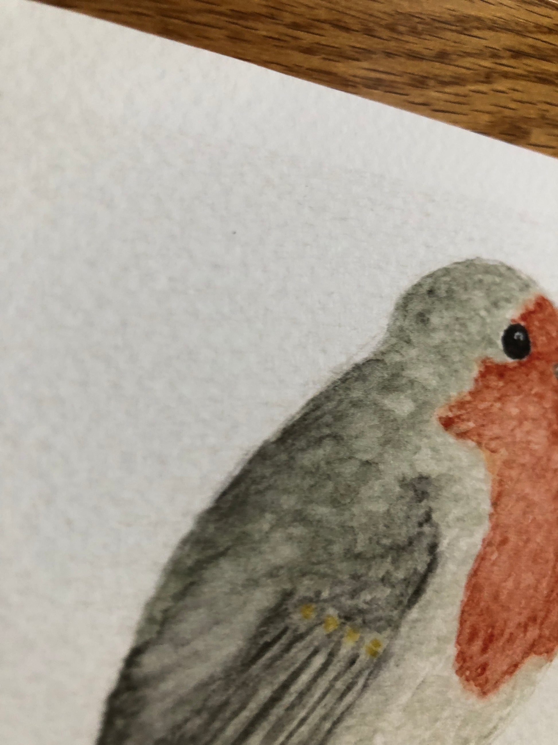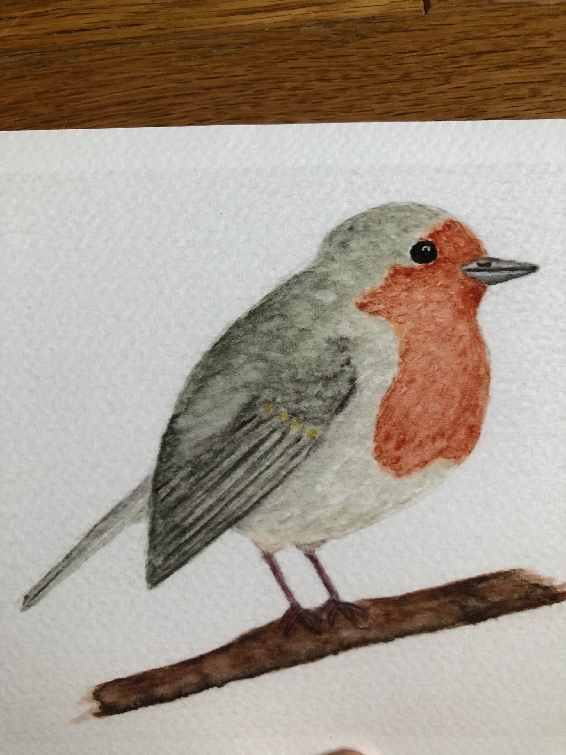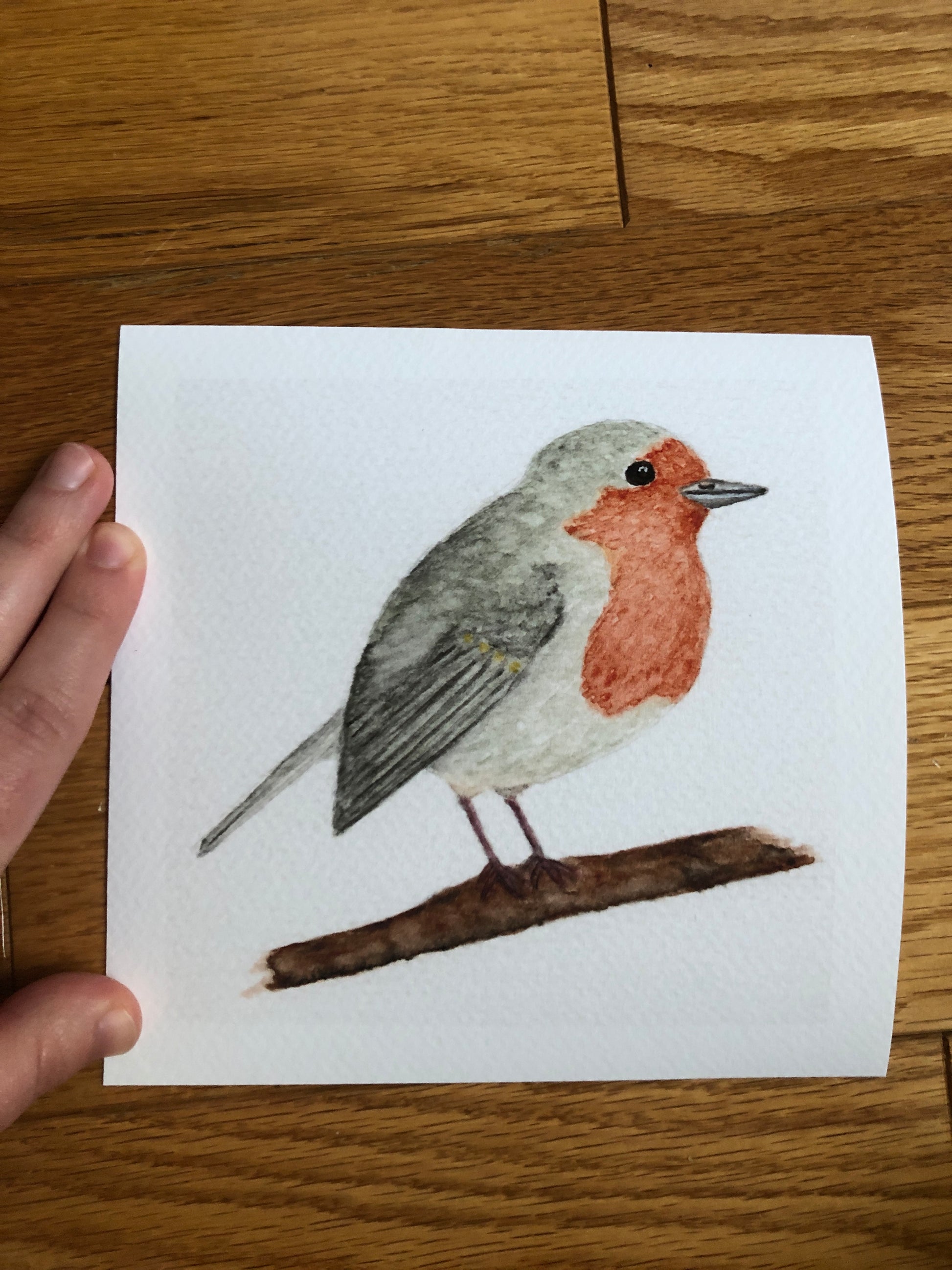 An English Robin watercolor painting, printed on 5"x5" watercolor paper, with a 1/2" border.
