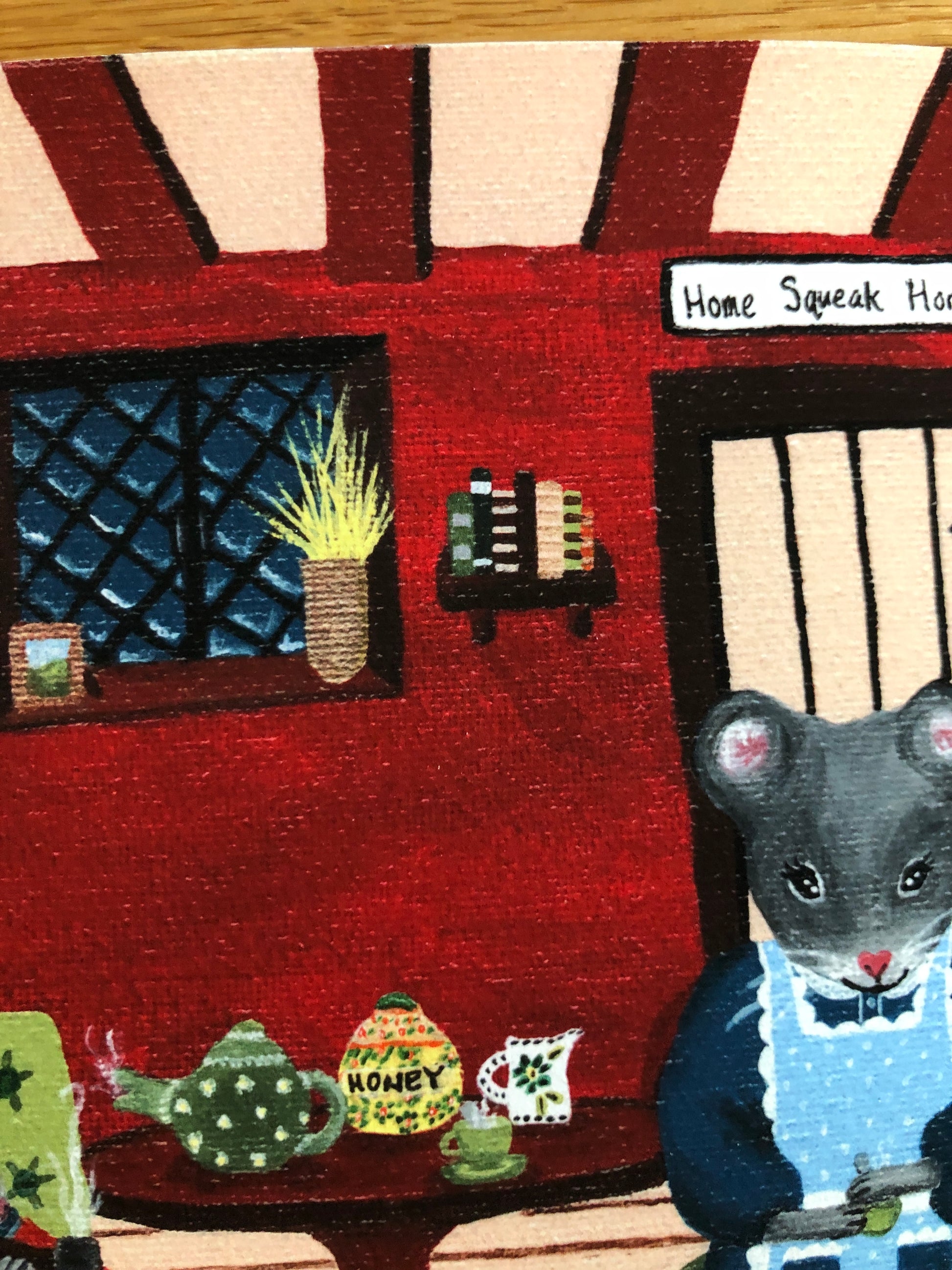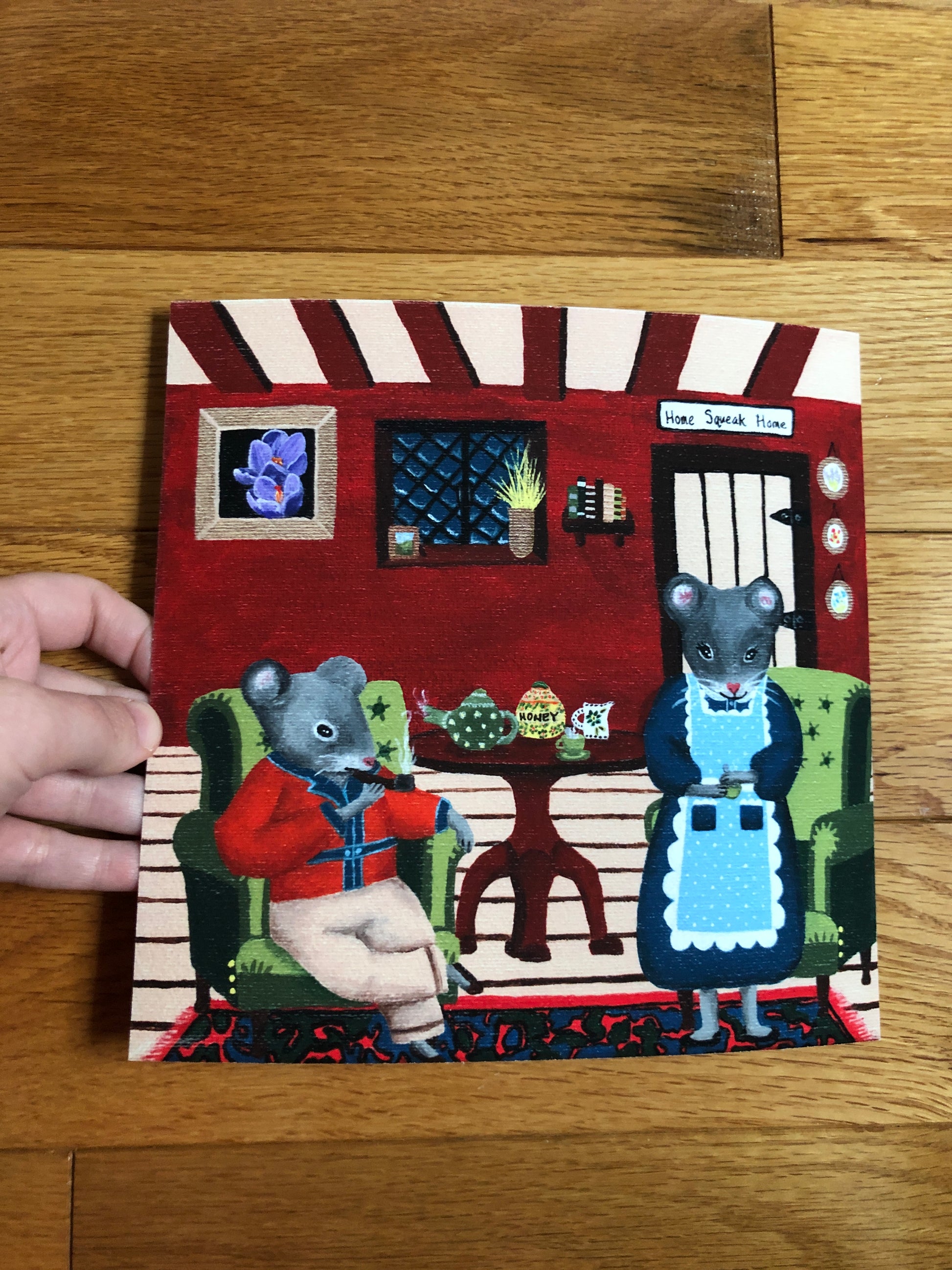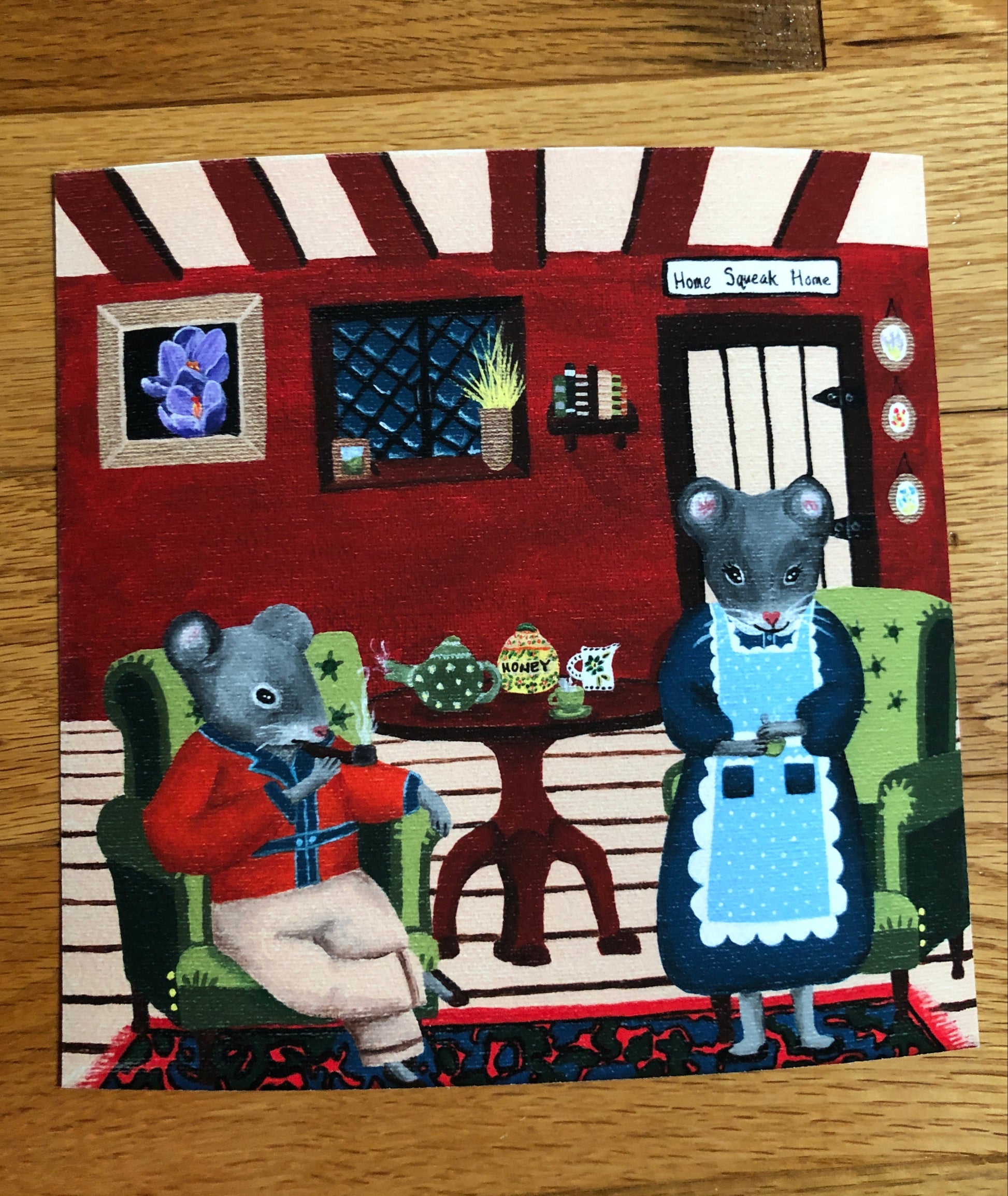 A whimsical acrylic painting, "Home Squeak Home", printed on Hahnemühle William Turner paper (it feels slightly textured, and is thicker than copy paper - see detail photos).