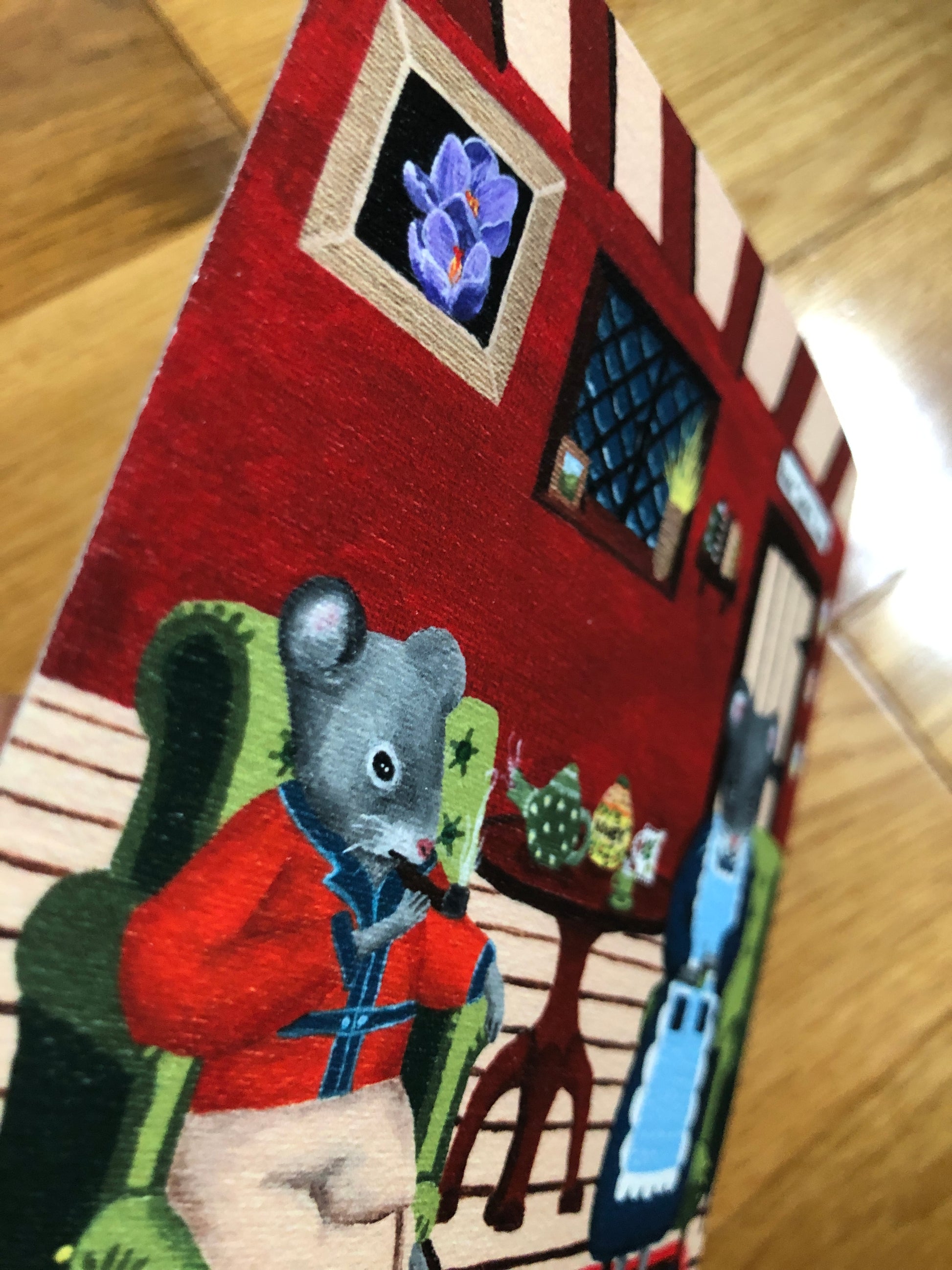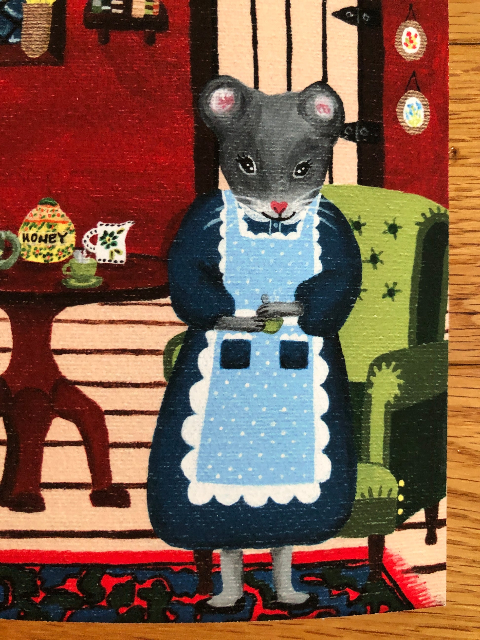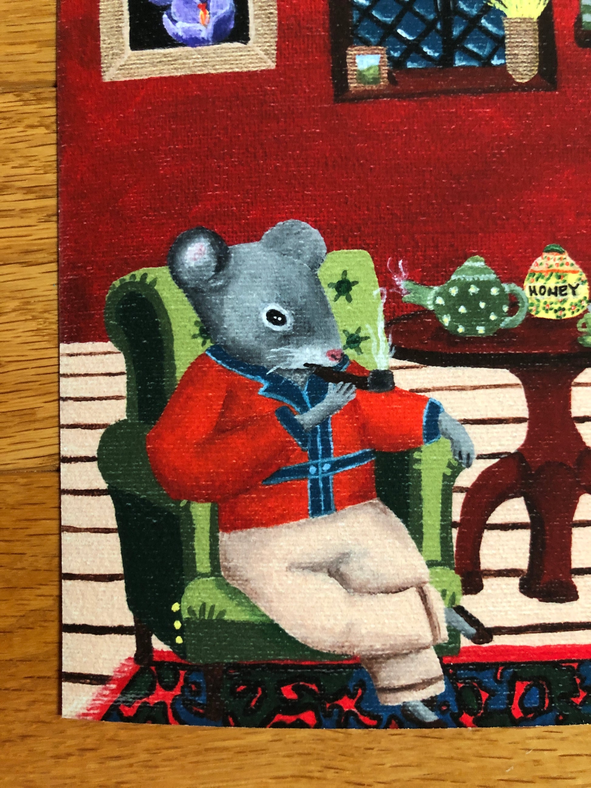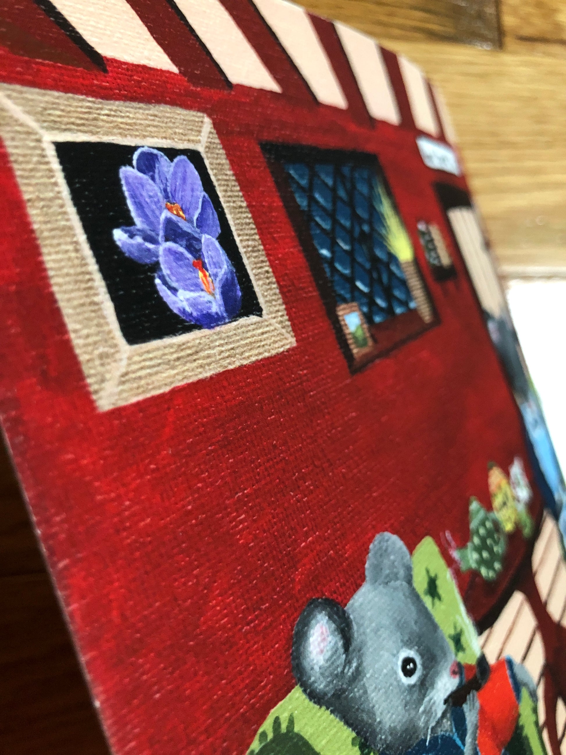 A whimsical acrylic painting, "Home Squeak Home", printed on Hahnemühle William Turner paper (it feels slightly textured, and is thicker than copy paper - see detail photos).