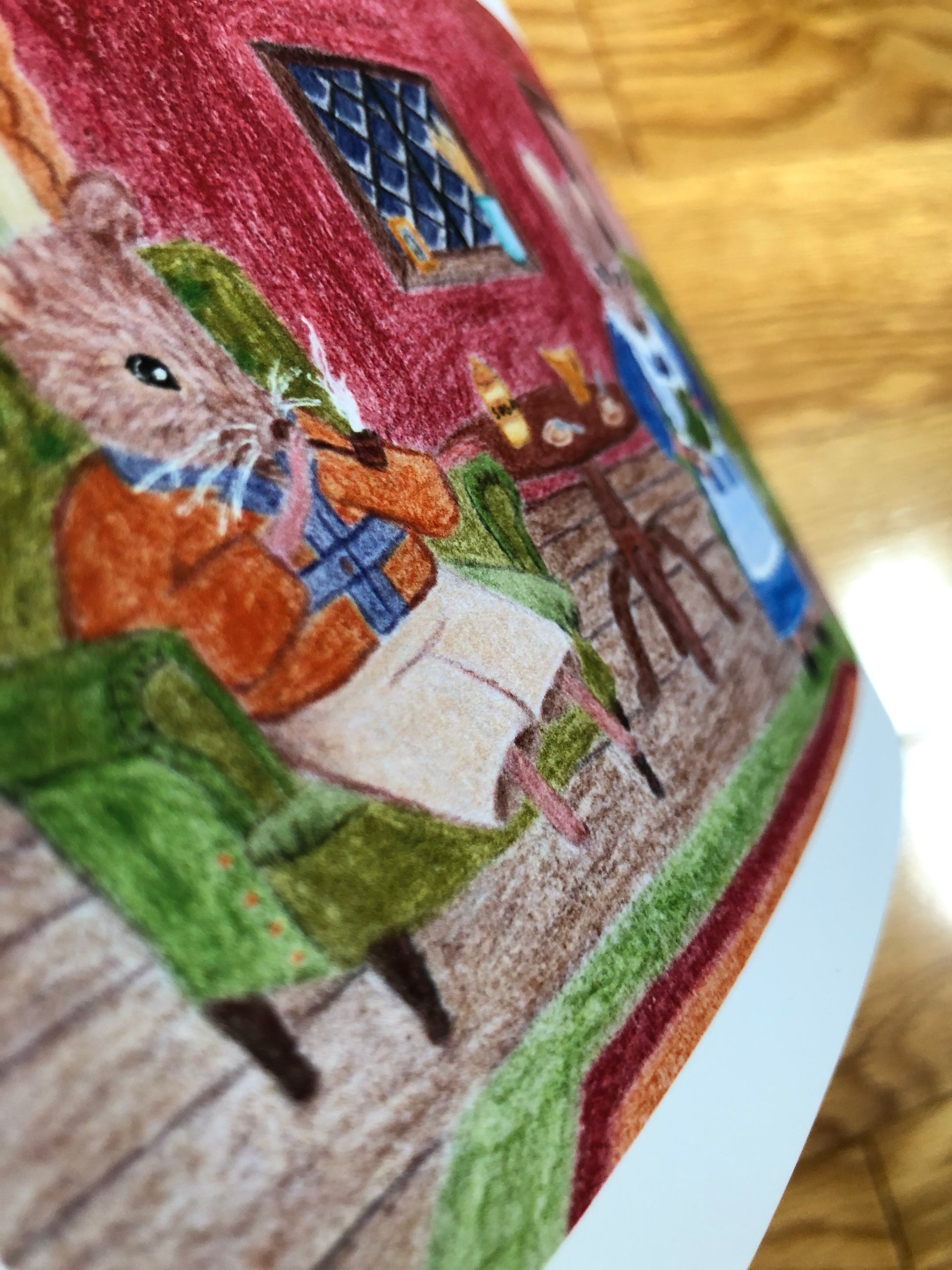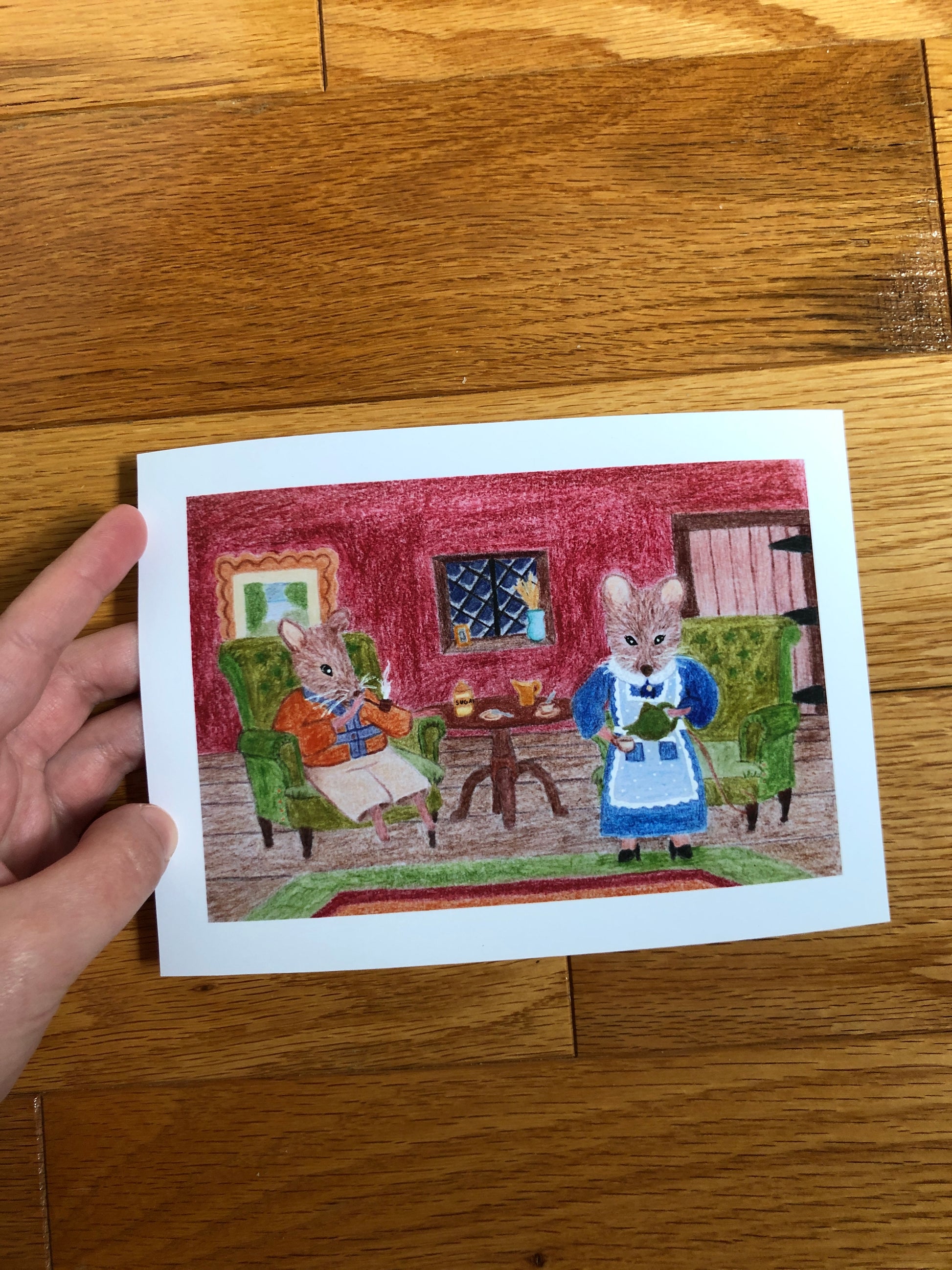 My original colored pencil drawing, "Home Squeak Home", printed on archival matte paper, comes in two sizes: 6" x 4" and 8" x 5", each with a 1/2" inch border.