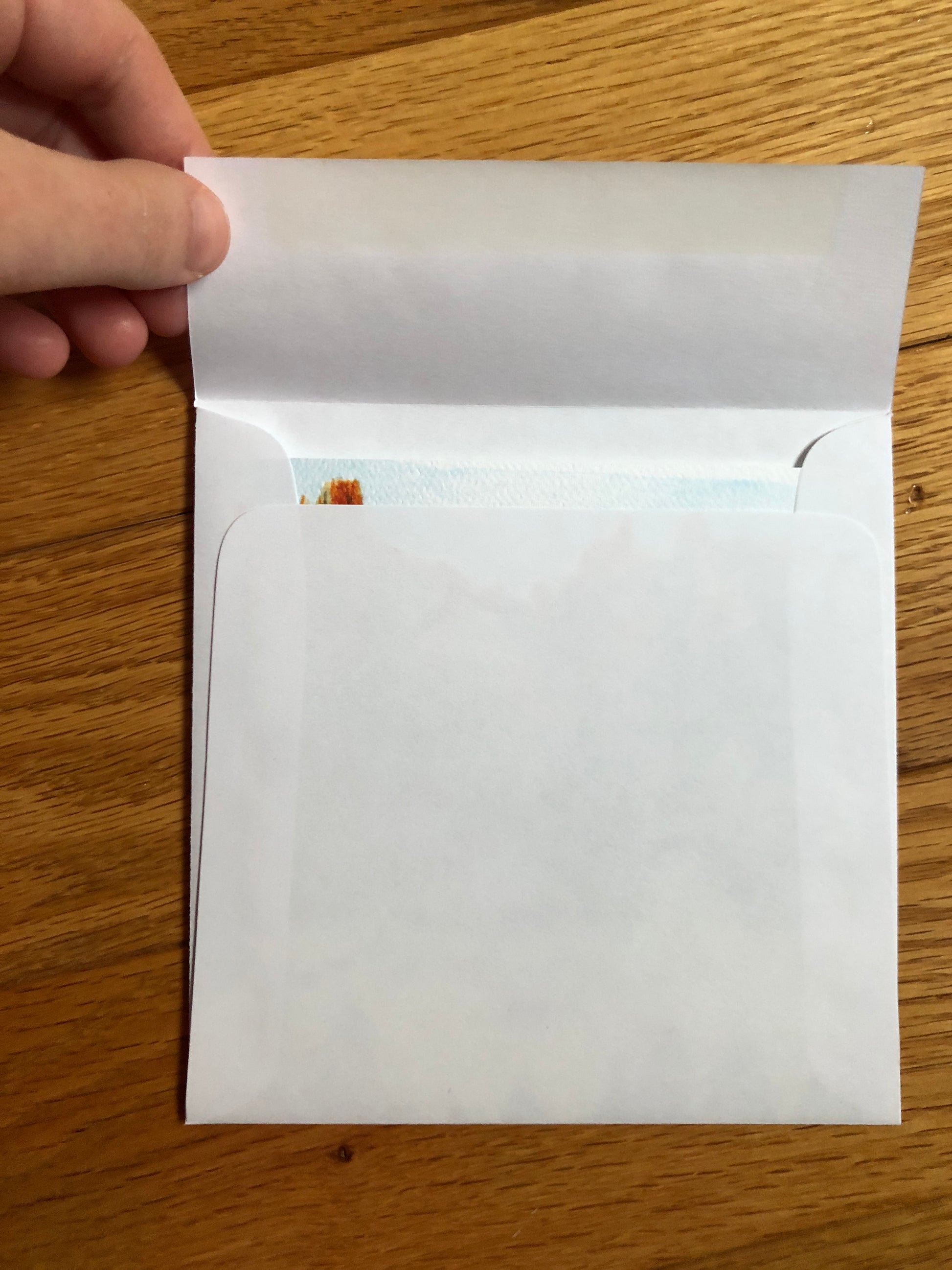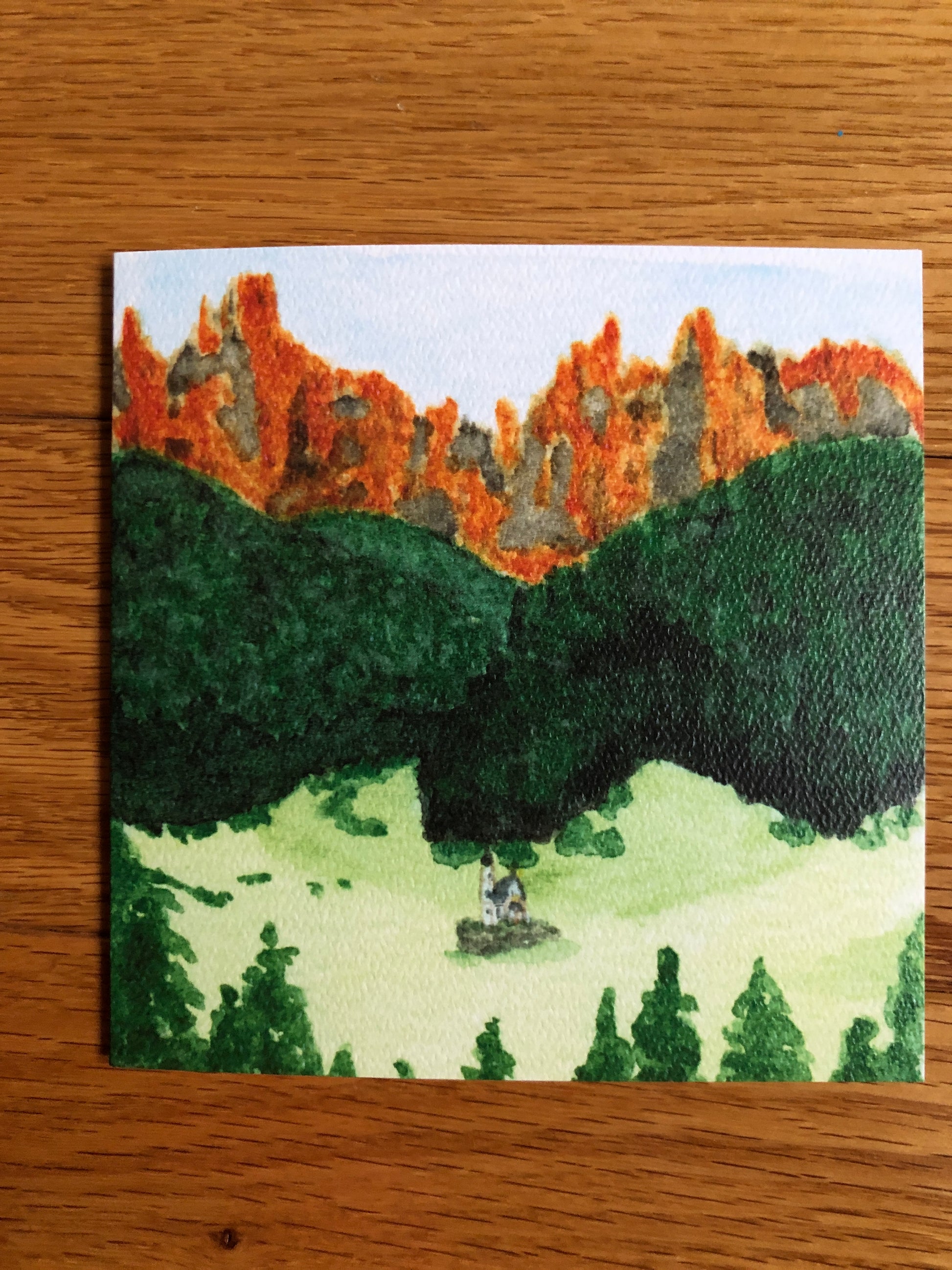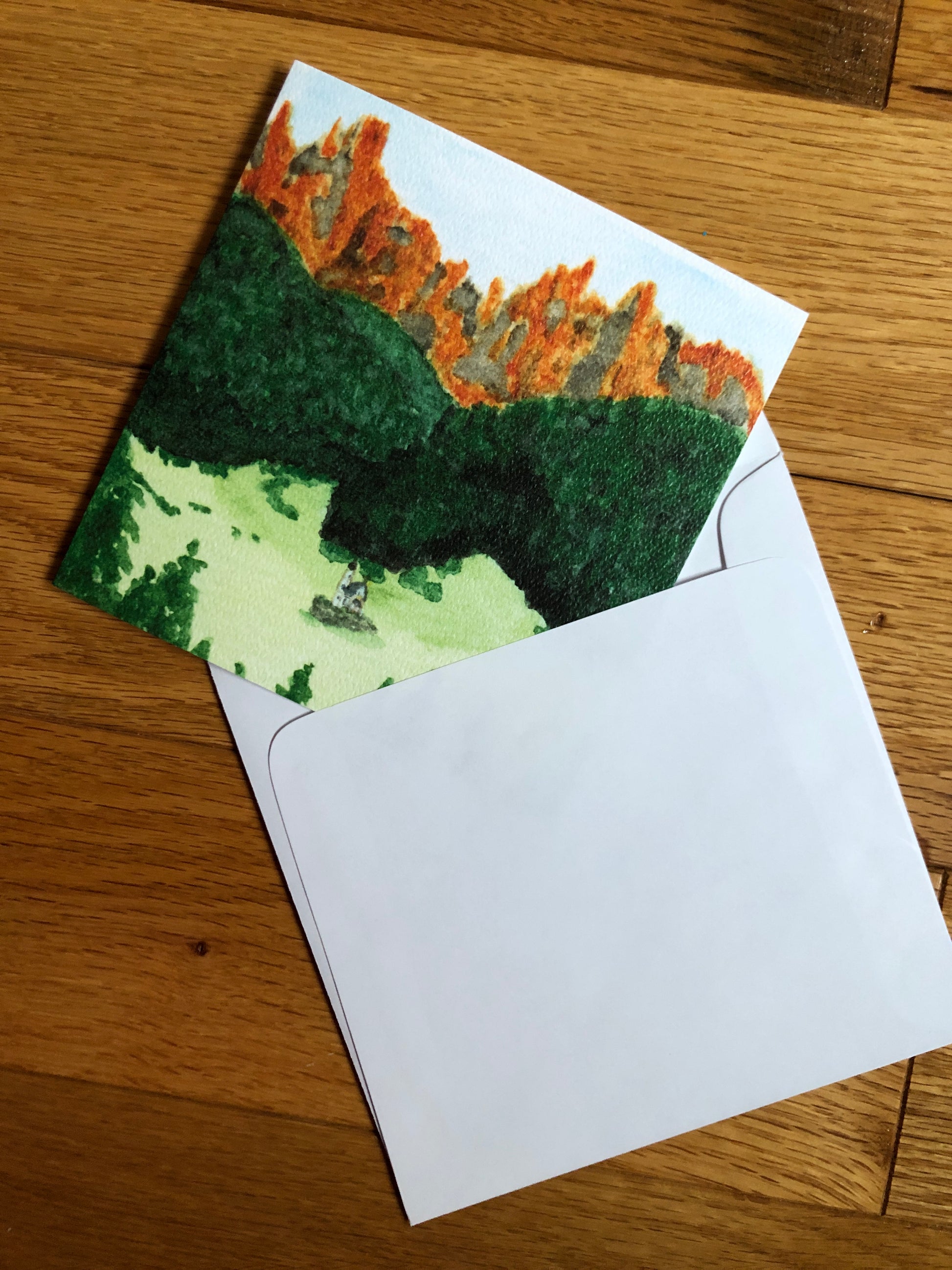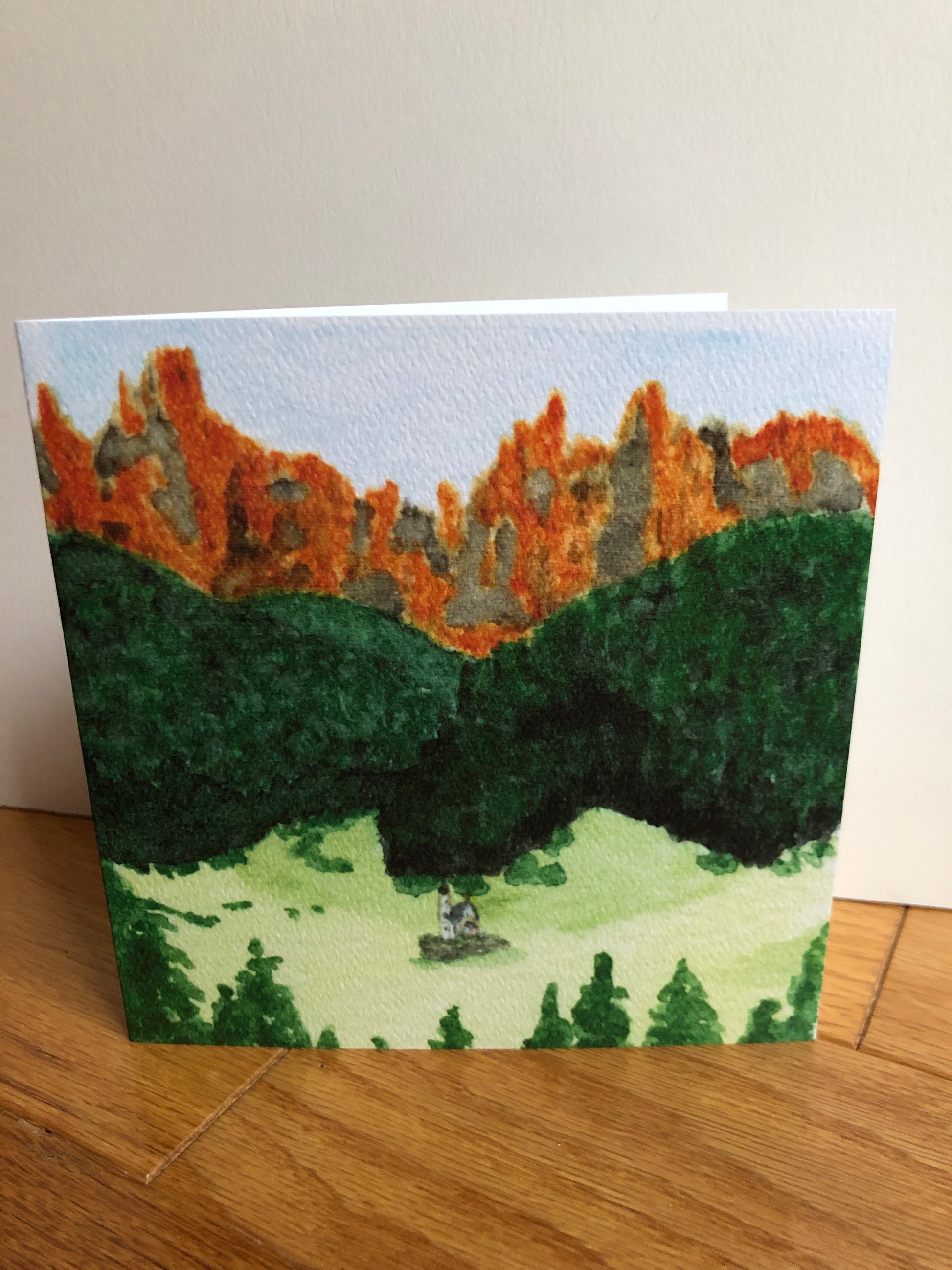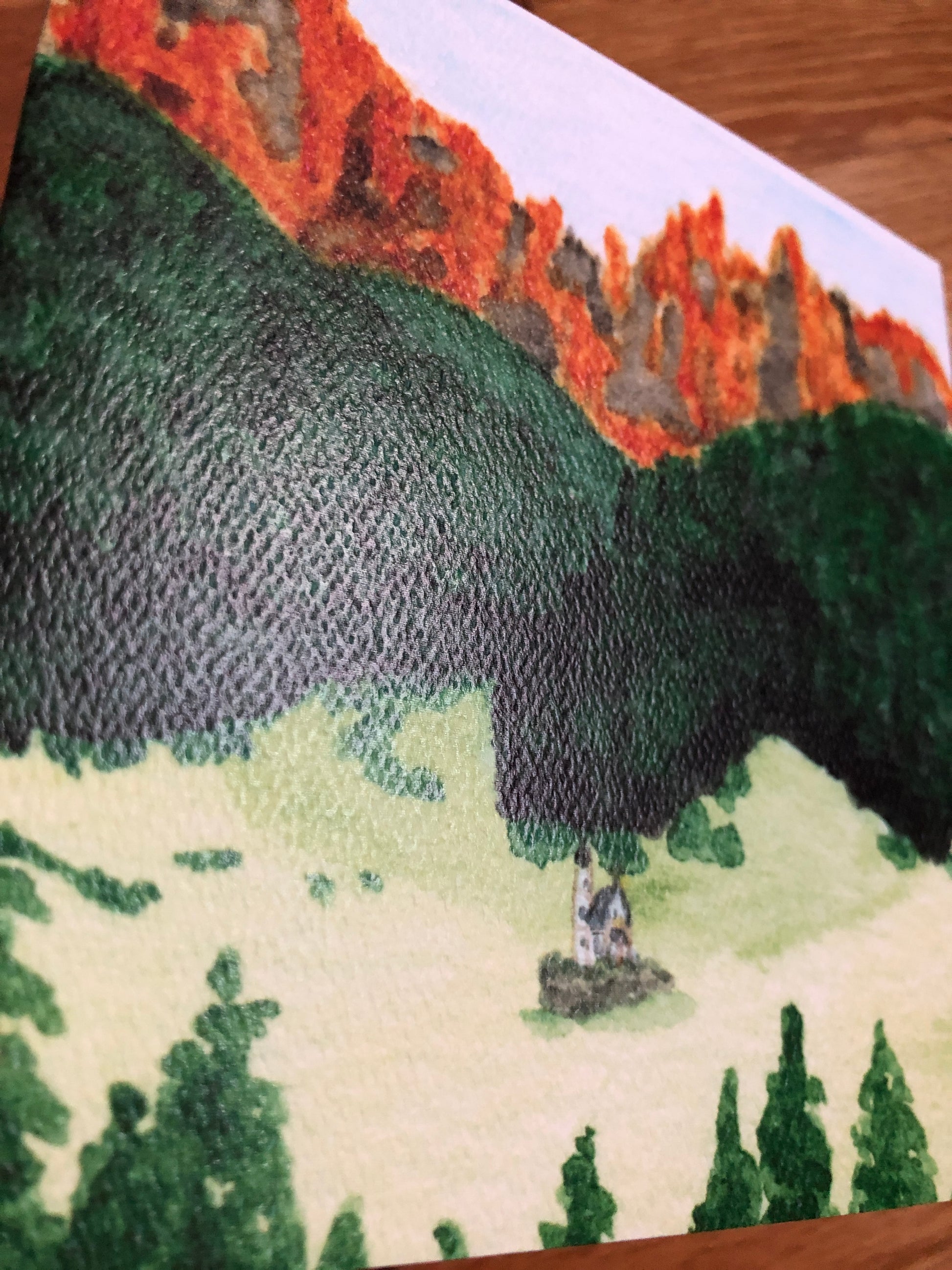These notecards feature a watercolor painting of San Giovanni Church in Funes, Italy, printed on 5"x5" matte paper. Envelope is included; blank inside.