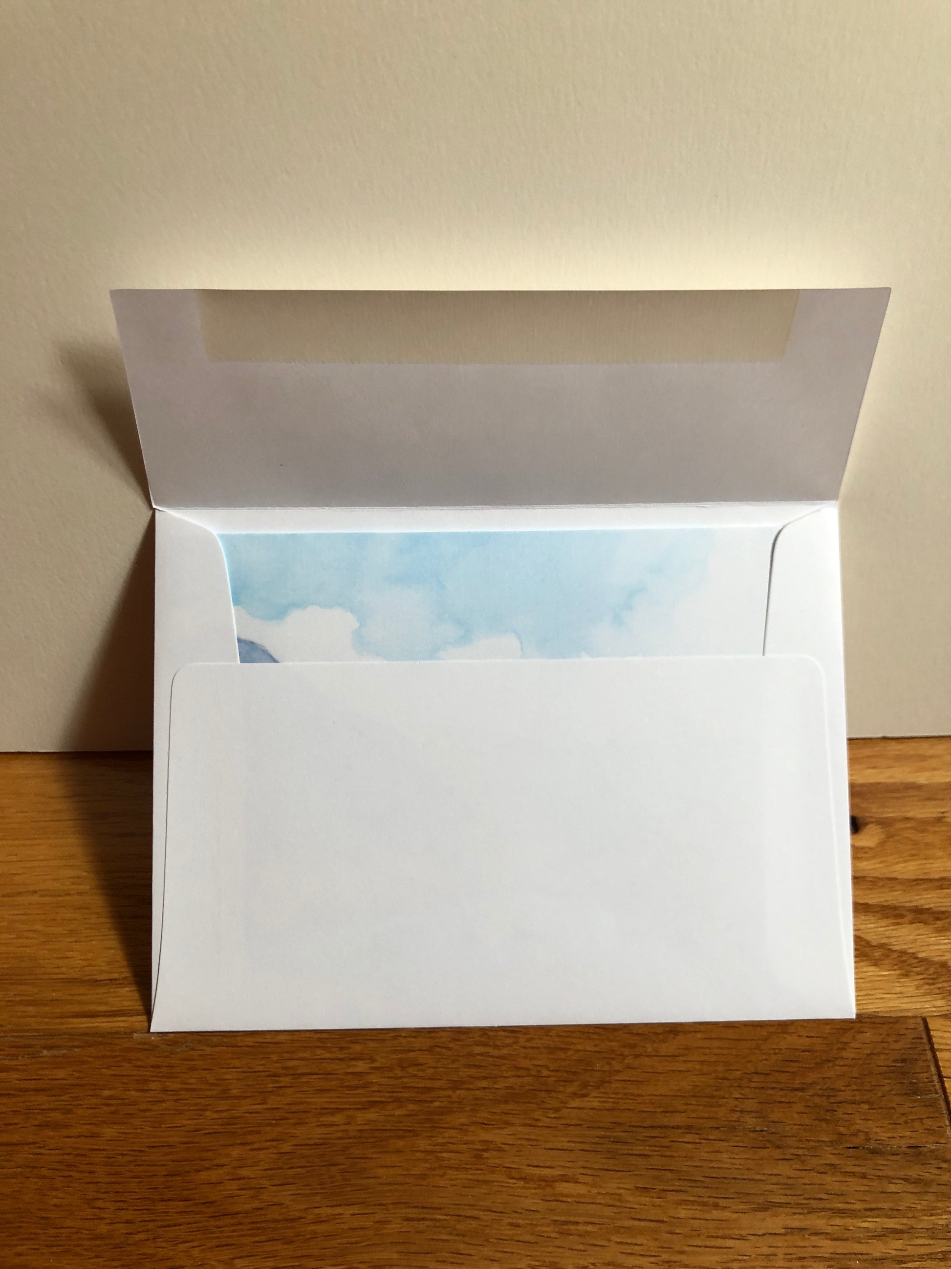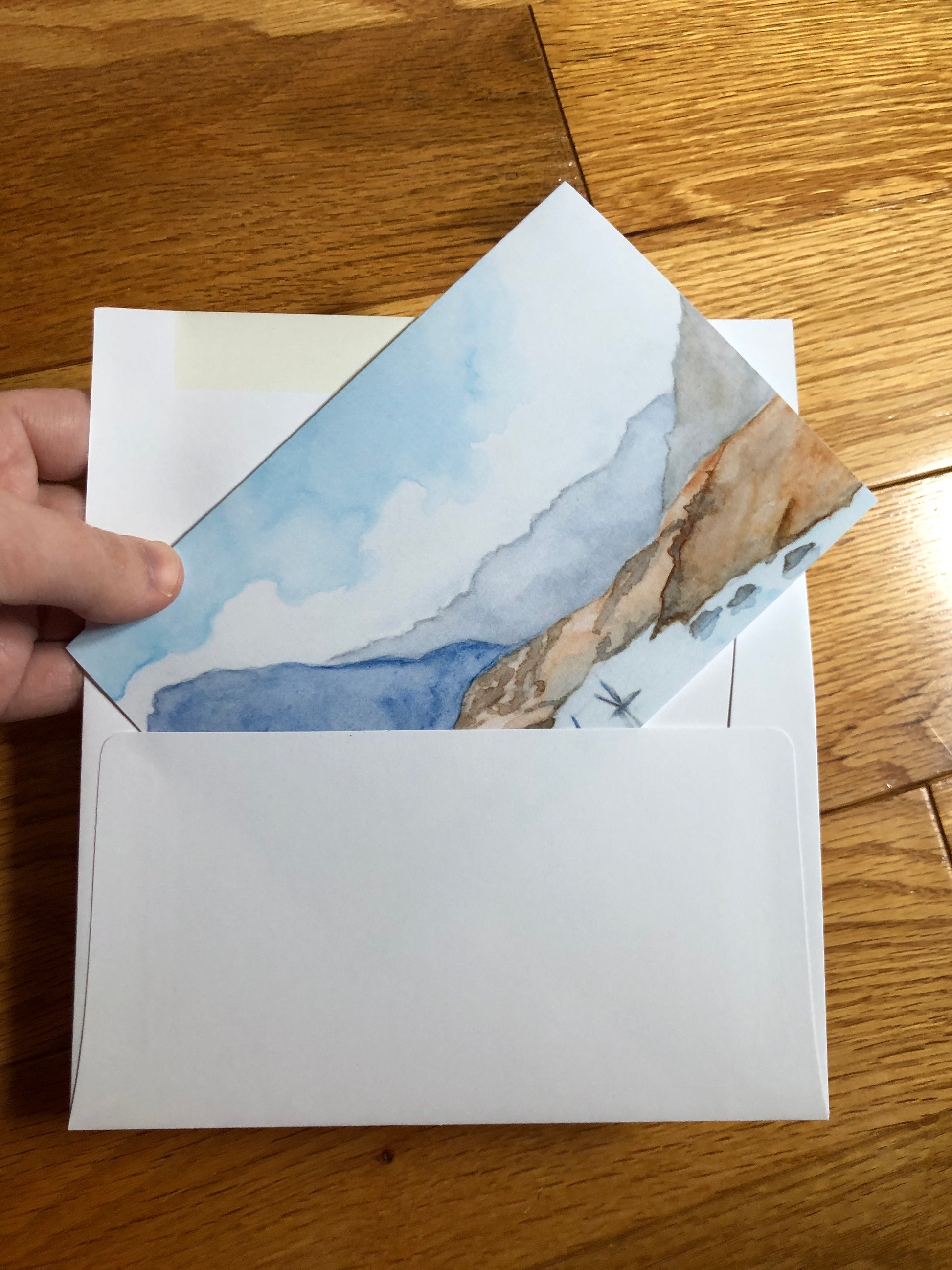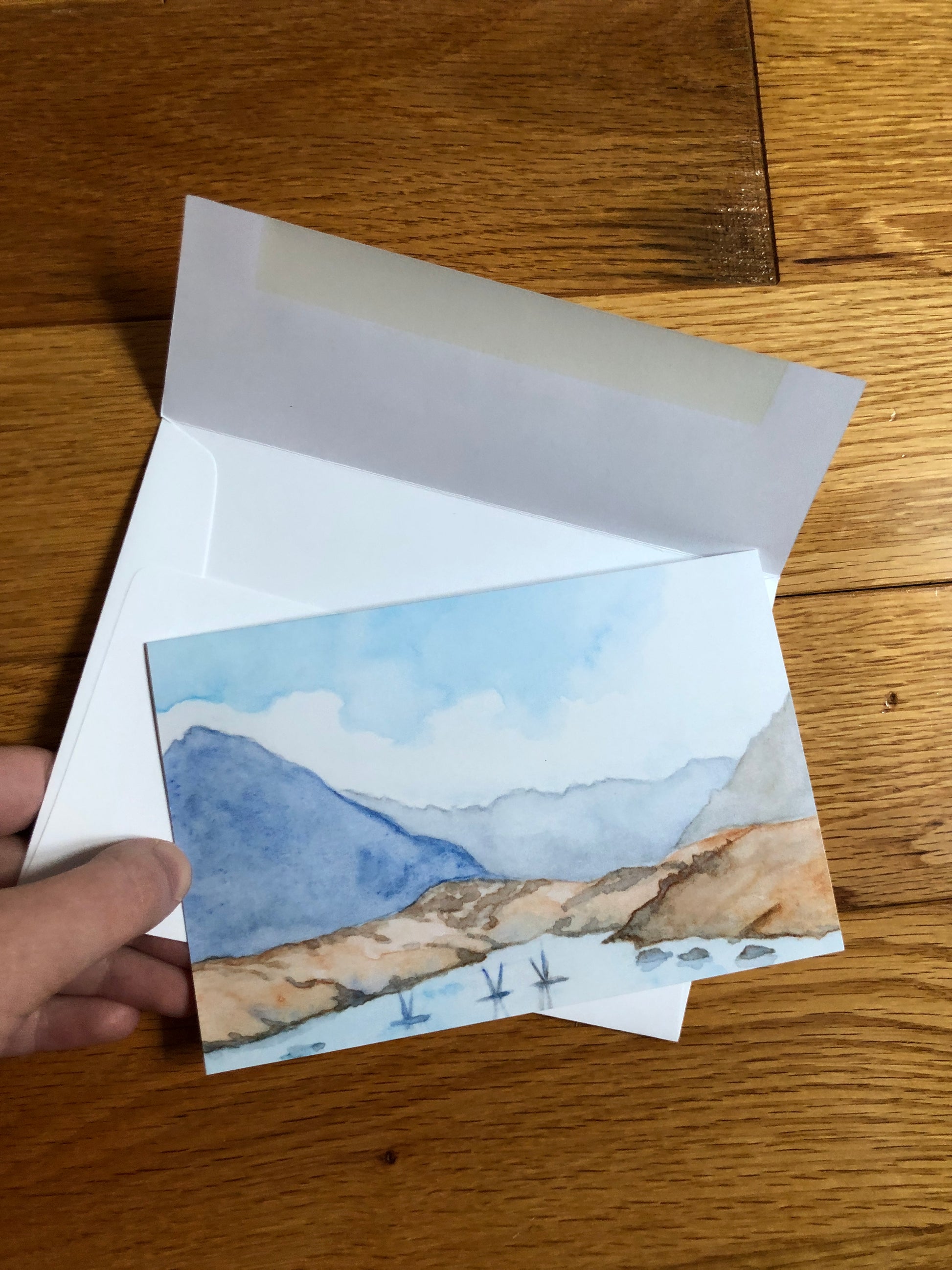 These notecards feature an original watercolor painting of a serene landscape printed on 6"x4" matte paper. Envelope is included; blank inside.