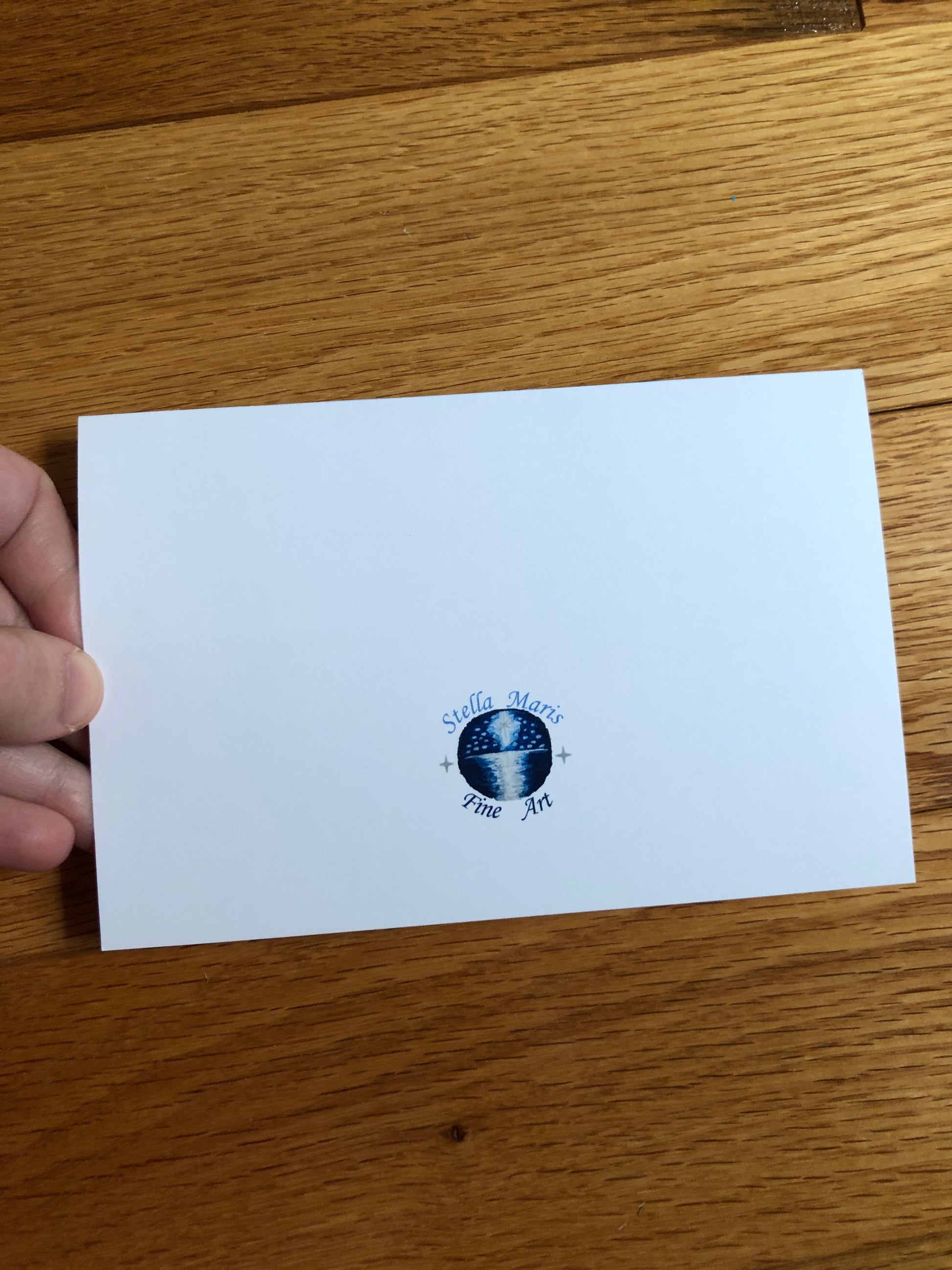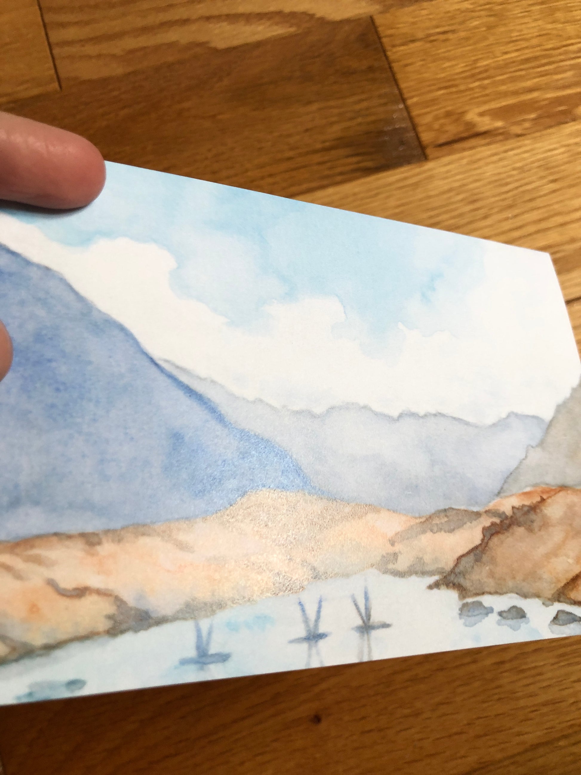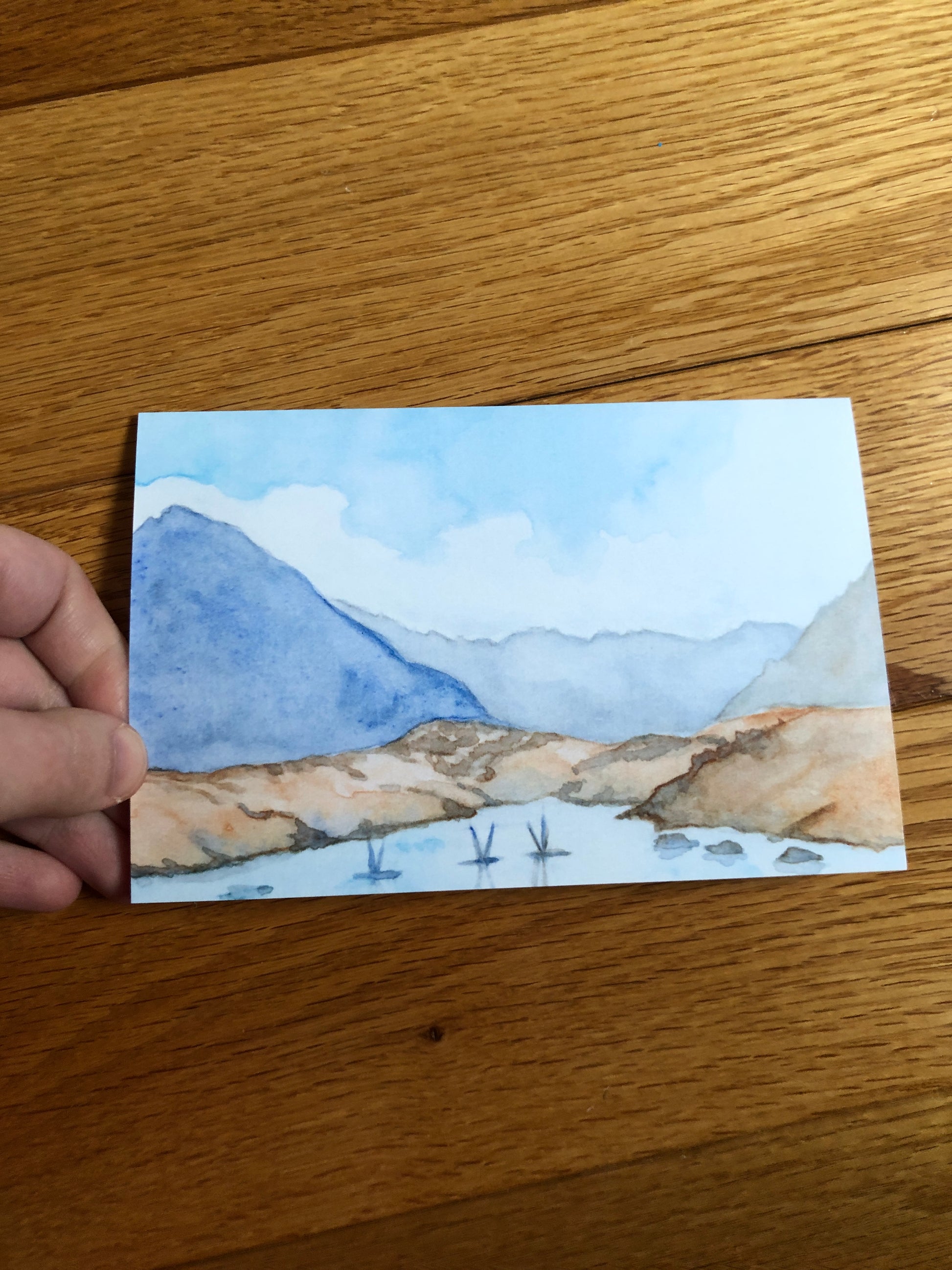 These notecards feature an original watercolor painting of a serene landscape printed on 6"x4" matte paper. Envelope is included; blank inside.