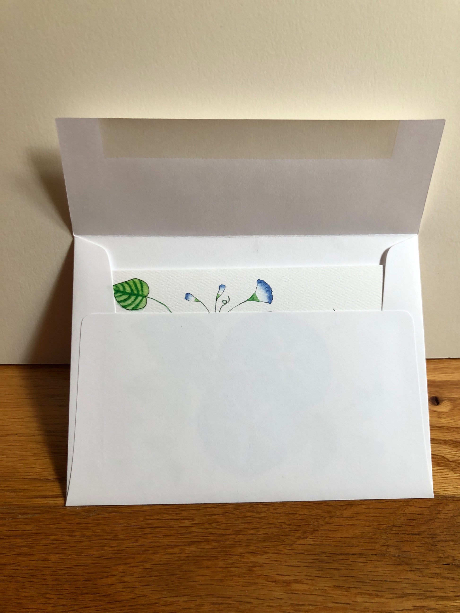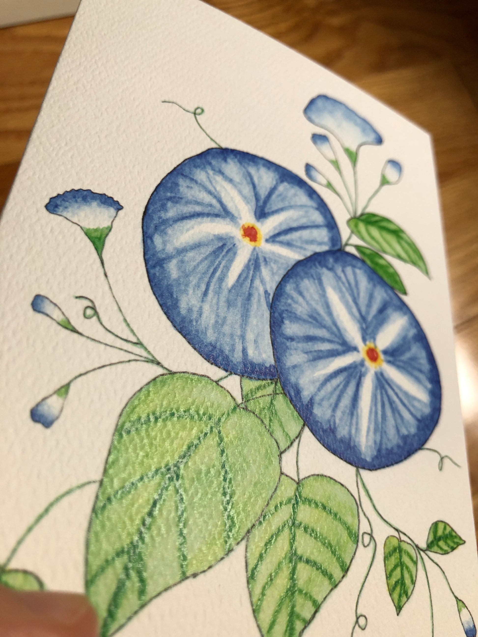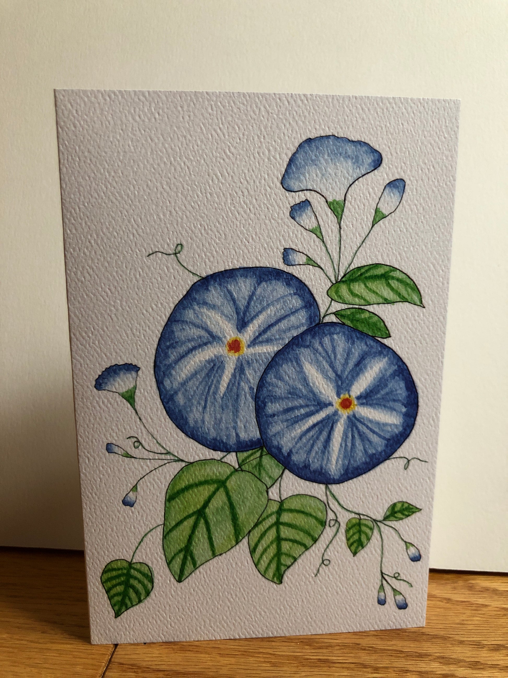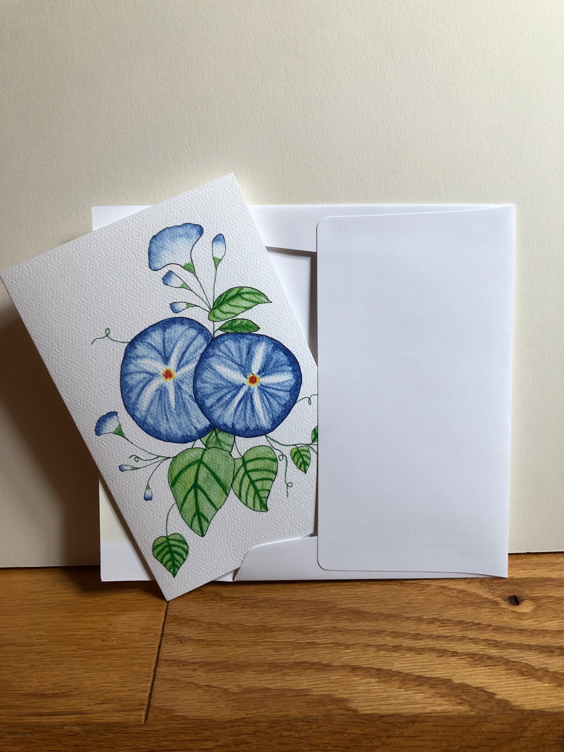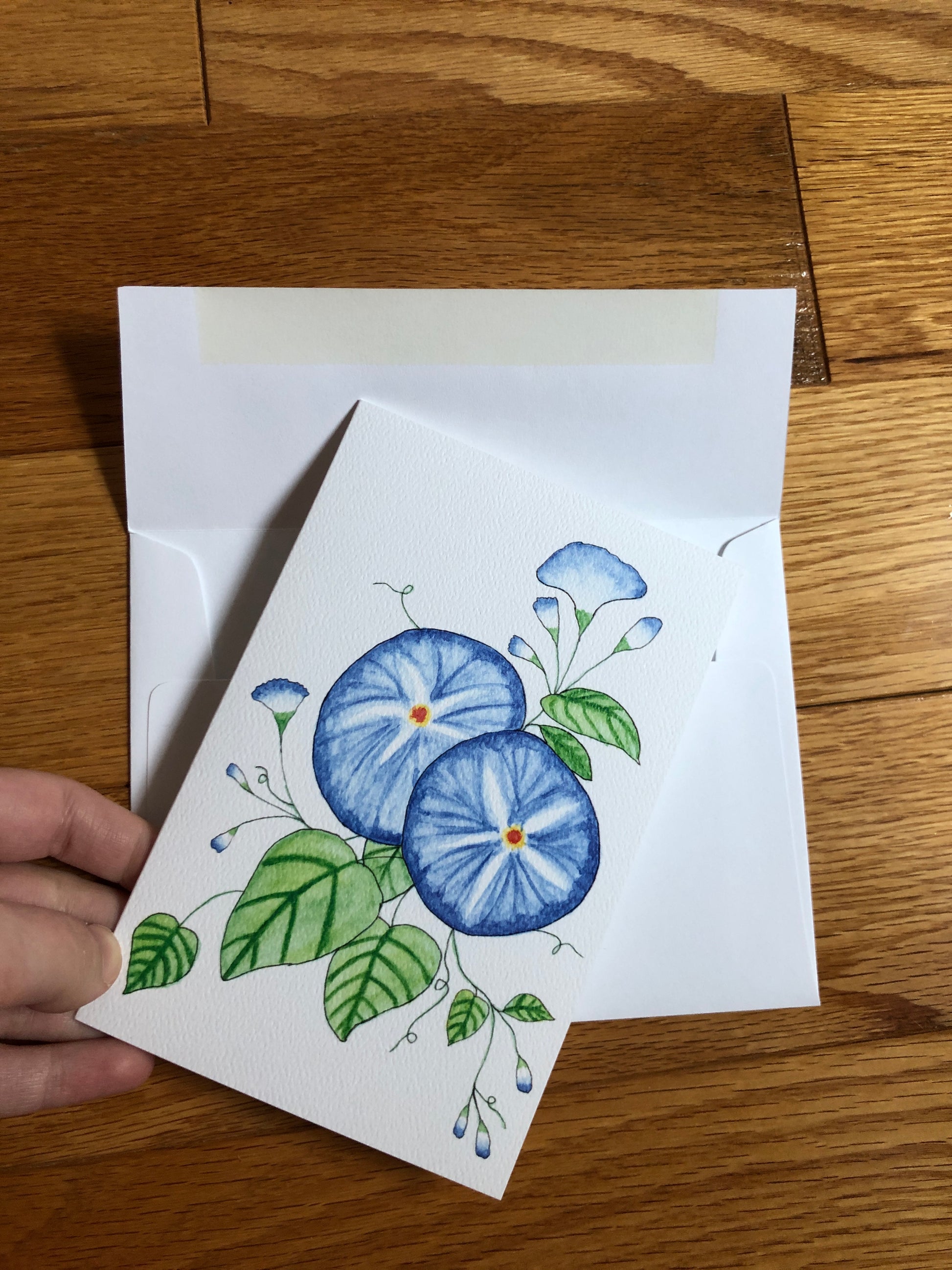 This notecard features an watercolor painting of morning glories, printed on 4"x6" watercolor felt paper (slightly textured, see photos). Envelope is included; blank inside.