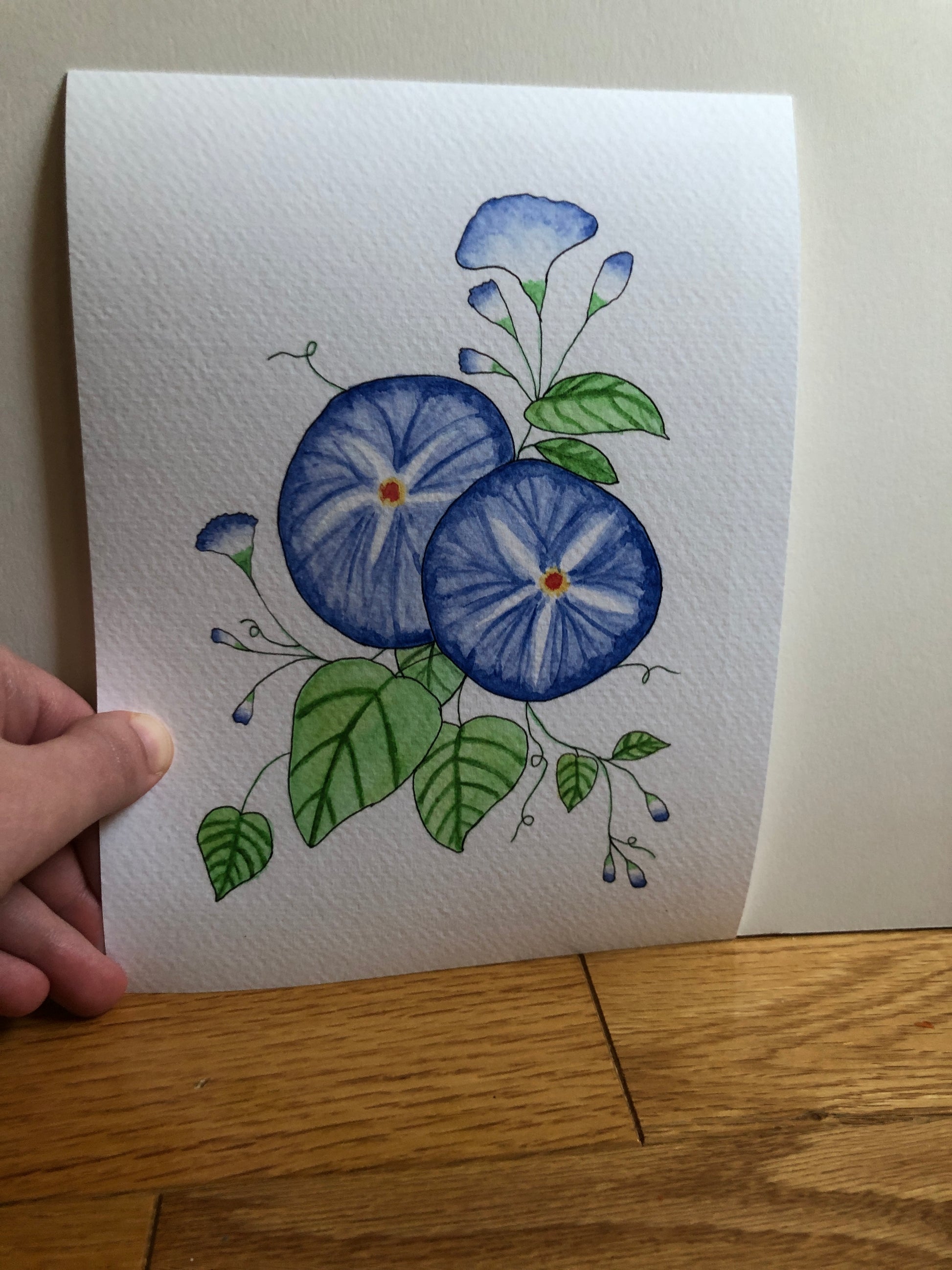 This lovely morning glory watercolor painting is printed on watercolor paper (slightly textured), and is 5" x 7", with a 1/2" border.